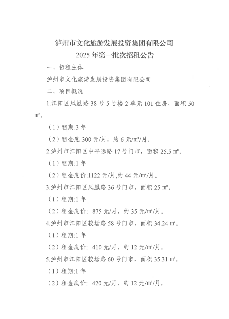 瀘州市文化旅游發(fā)展投資集團(tuán)有限公司2025年第一批次招租公告