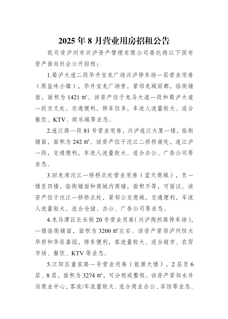 興瀘資產(chǎn)公司2025年8月營業(yè)用房招租公告